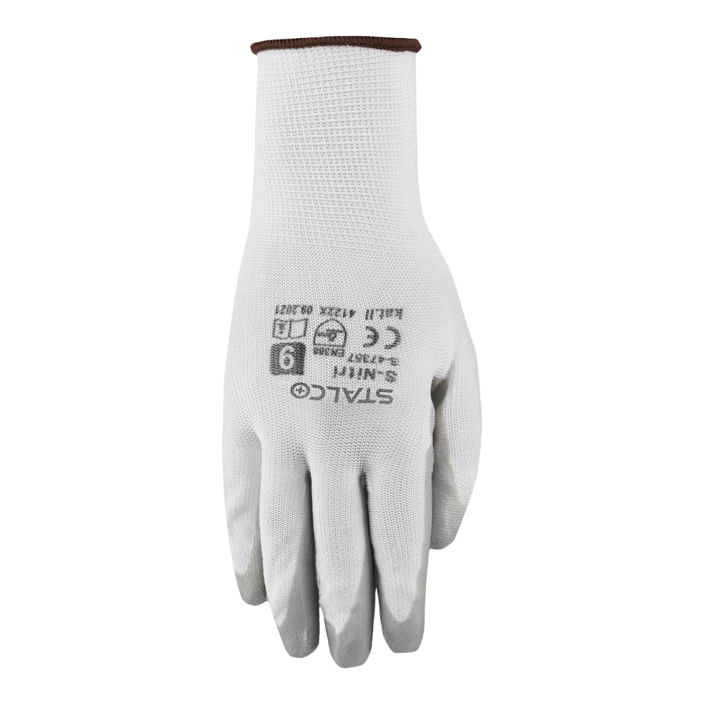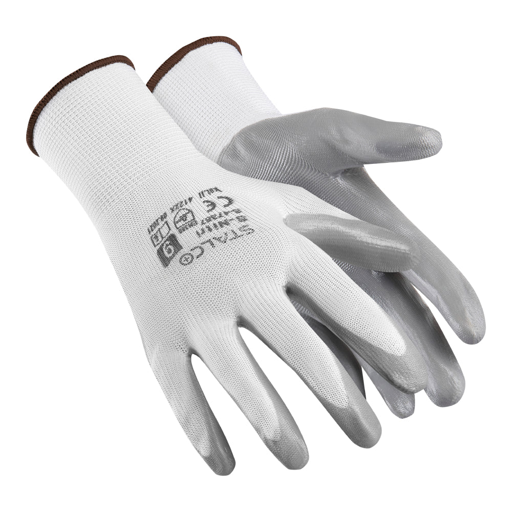 Rękawice poliamidowe S-Nitri STALCO zostały wykonane z tkaniny poliamidowej sploty 13g. Taki materiał zapewnia im elastyczność i chroni przed skaleczeniem. Po wewnętrznej stronie dłoni znajduje się powłoka nitrylowa. Stanowi warstwę ochronną przed działaniem wilgoci i substancji płynnych, a także ułatwia utrzymanie w dłoni małych i śliskich elementów. Rękawice są w kolorze białym z szarym wykończeniem. W ofercie STALCO rękawice poliamidowe S-Nitri są dostępne w wymiarach od 7 do 10.